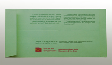 The cover depicts the facade of the school’s building. It is surrounded by a rectangular golden border. The full cover is light green in colour. The reverse of the cover contains a brief description of the school. The description of the design on the cover, the cancellation and the emblem of the DOP with bilingual wordings ‘DOP, Maharashtra & Goa Circle’ appears at the bottom of the envelope. The special cancellation is square in shape. The emblem and the motto, ‘Knowledge is Light’ is in the centre. The name of the School is written in Devnagri script on the left side and in Roman Script on the right. The date of release (18-12-2009) and the Place (Mumbai) with the Pin code of the school (400 014.) are at the bottom.